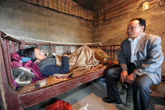 (谌贻贵(右)到珠藏镇鱼塘村大屋基组瘫痪村民艾家福家走访。 陶亮 摄)