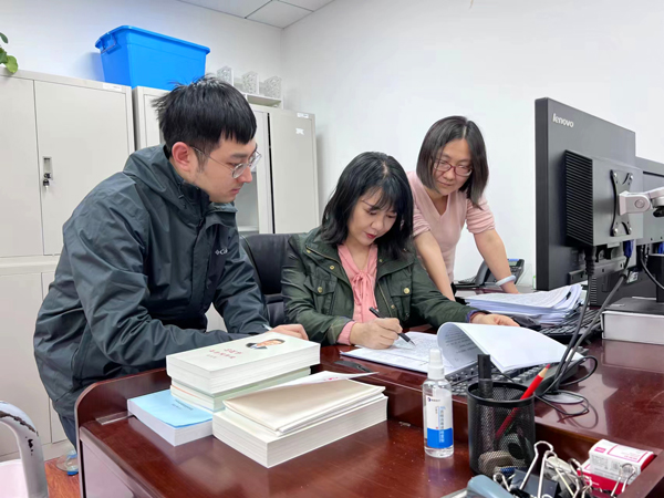 图为中央纪委国家监委信访室六处处长孙慧(中)正在与同事研判信访件。吕佳蓉 摄