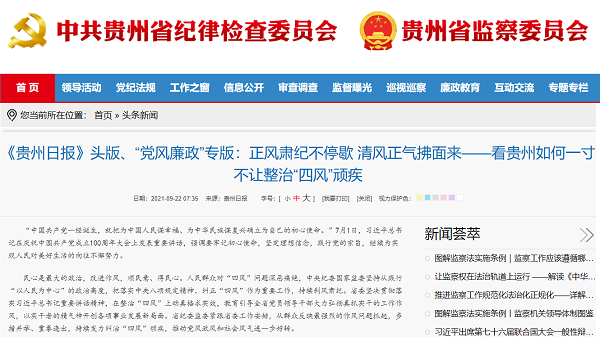 2021年9月22日贵州省纪委监委网站 头条新闻