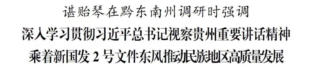 2月24日至25日,省委书记、省人大常委会主任谌贻琴深入黔东南州镇远县、施秉县、黄平县、凯里市调研。她强调,要深入学习贯彻习近平总书记视察贵州重要讲话精神,抓住用好新国发2号文件重大机遇,全力以赴围绕“四新”主攻“四化”,加快推动民族地区高质量发展,以实际行动迎接党的二十大和省第十三次党代会胜利召开。