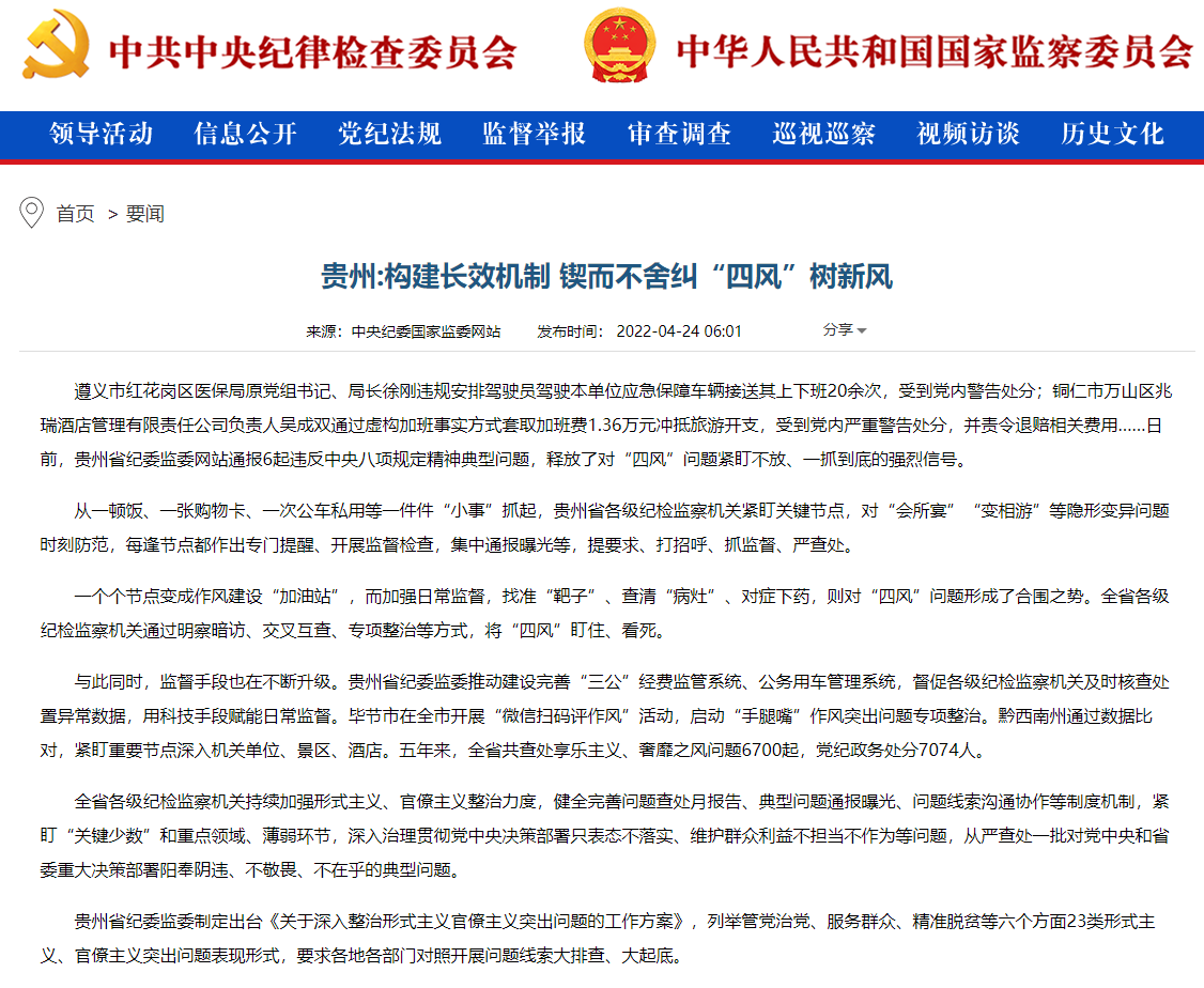 从一顿饭、一张购物卡、一次公车私用等一件件“小事”抓起,贵州省各级纪检监察机关紧盯关键节点,对“会所宴”“变相游”等隐形变异问题时刻防范,每逢节点都作出专门提醒、开展监督检查,集中通报曝光等,提要求、打招呼、抓监督、严查处。
