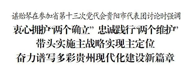 谌贻琴强调,要深刻学习领会衷心拥护“两个确立”、忠诚践行“两个维护”是本次党代会的主旨灵魂,更加深刻把握“两个确立”的决定性意义,更加深刻体悟习近平总书记对贵州各族人民的特殊关心厚爱,更加深刻认识习近平总书记对贵州工作的科学指引,真正把衷心拥护“两个确立”、忠诚践行“两个维护”体现在贯彻落实党中央决策部署的行动上,体现在履职尽责做好本职工作的实效上,始终让忠诚核心成为贵州党员干部最鲜明的政治品格、成为贵州政治生态最鲜明的政治底色。要深刻学习领会“发展不足、质量不高”是贵州社会主要矛盾的主要方面,始终把发展作为第一要务,一刻不停抓发展,一门心思抓高质量发展,加快实现“三个转变”,着力打造竞争新优势。要深刻学习领会主战略主定位是坚持以高质量发展统揽全局的必然选择,紧紧围绕主战略、主定位抓落实,更加注重改革推动、开放带动、创新驱动、人才支撑,奋力开创贵州高质量发展新局面。要深刻学习领会奋力谱写多彩贵州现代化建设新篇章是贵州未来发展的奋斗目标,在工作的安排、措施的制定、节奏的把握上都要聚焦这个目标,一步一个脚印,踏踏实实前行,积小胜为大胜,确保与全国同步实现社会主义现代化、实现第二个百年奋斗目标。要深刻学习领会毫不动摇加强党的建设是高质量发展的根本保证,把党的领导进一步强化,把各级党组织建设得更加坚强有力,把全省上上下下、方方面面的力量凝聚在党的周围,带领广大党员干部群众在现代化建设中努力干成一番新事业、干出一片新天地。