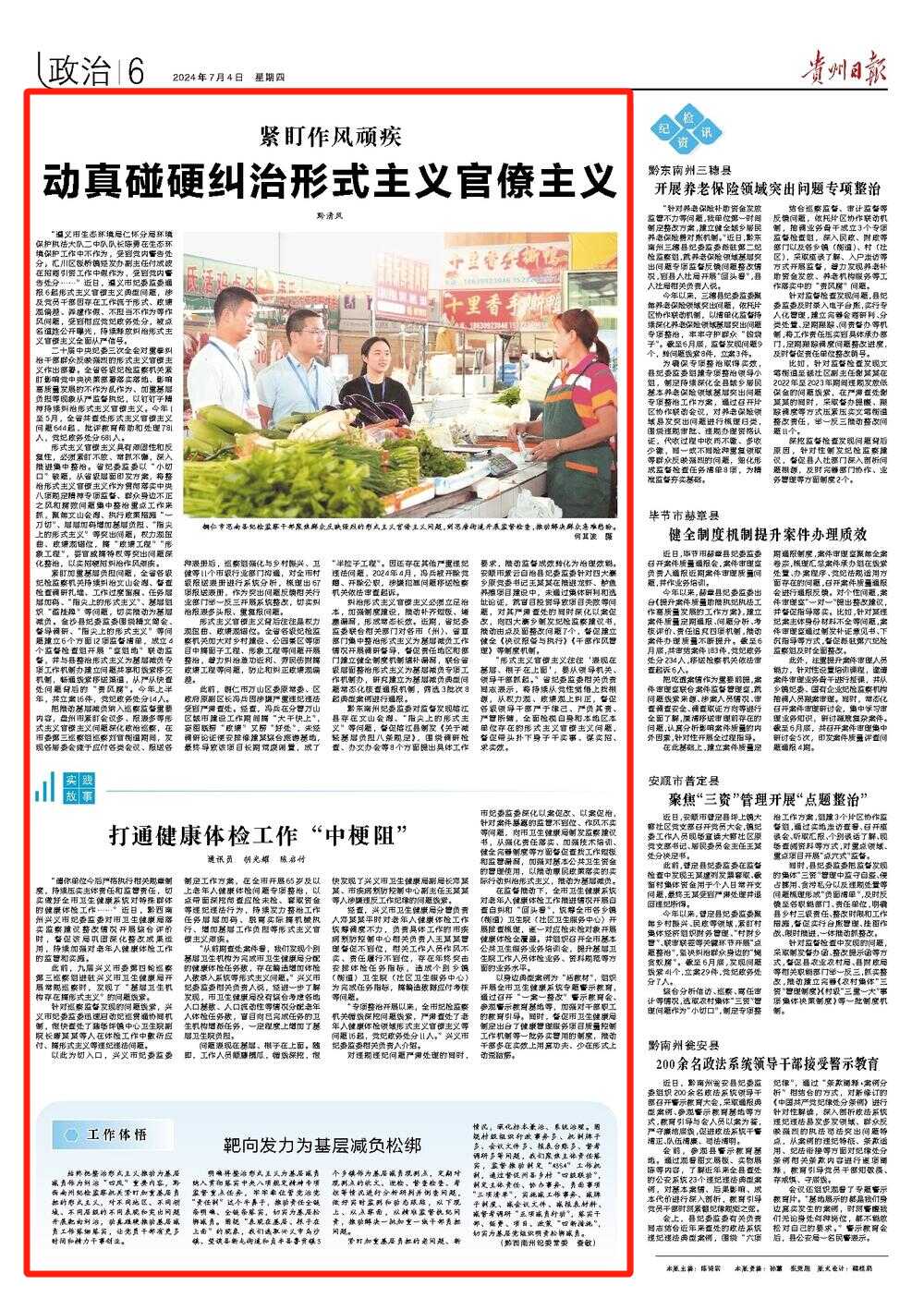 以此为切入口,兴义市纪委监委制定工作方案,在全市开展65岁及以上老年人健康体检问题专项整治,以点带面深挖彻查应检未检、套取资金等违纪违法行为,持续发力整治工作任务层层加码、脱离实际搞机械执行、增加基层工作负担等形式主义官僚主义顽疾。