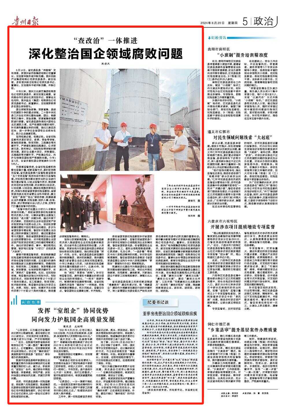 做好案件查办“后半篇文章”也是“室组企”联动监督的重要一环。在从严查处国企领域腐败分子的同时,我们坚持系统施治、标本兼治,将查办案件与扎实推进以案促教、促改、促治贯通起来,一体推进案件剖析、问题整改、建章立制、警示教育等工作,深入查摆违纪违法案件背后的制度机制漏洞、监督管理方面存在的薄弱环节,通过采取监督“回头看”、制发纪检监察建议书、约谈提醒有关领导等,督促案发单位、行业主管部门举一反三抓好整改落实,切实发挥查处一案、警示一片、治理一域的治本功能。(黔东南州委常委,州纪委书记、州监委主任 范省伟)