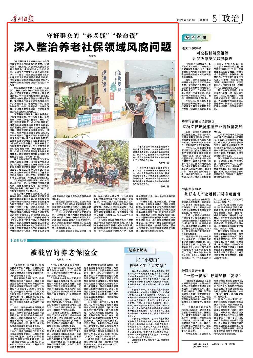 天柱县纪委监委整合监督力量,用好134名村级纪检监督员,对全县养老保险领域腐败问题开展“小切口”专项整治。针对监督发现凤城街道人社中心、社学街道等社保经办单位存在不规范审批、死亡人员领取养老保险、侵占挪用养老保险金等问题,及时向县人社部门制发监察建议书,督促其围绕社保基金收缴、待遇审核、资格认证等环节完善审批制度。
