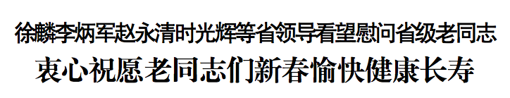 农历龙年新春佳节即将到来之际,近日,省委书记、省人大常委会主任徐麟,省委副书记、省长李炳军,省政协主席赵永清,省委副书记、省委政法委书记时光辉,省委常委李元平、卢雍政、吴强、郭强、时玉宝,省人大常委会党组书记、副主任陶长海,副省长董家禄、蔡朝林、郭锡文、贾利军、张敬平、罗强、杨同光,以各种形式分别看望慰问省级老同志,向老同志们致以崇高的敬意,感谢他们为贵州发展打下的坚实基础、作出的重要贡献,衷心祝愿他们新春愉快、健康长寿。