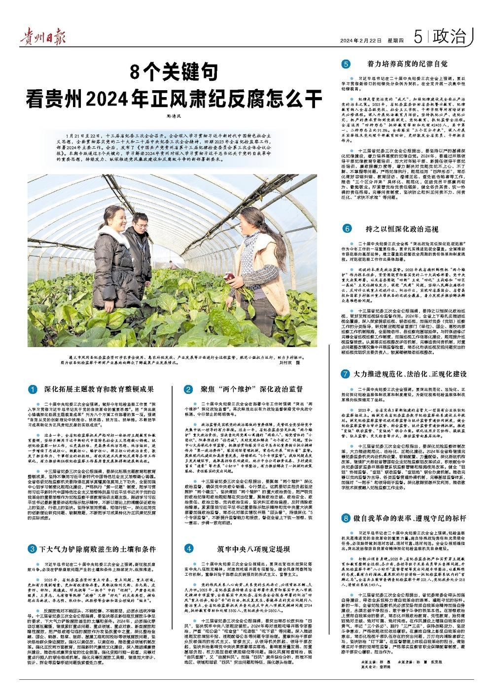 1月21日至22日,十三届省纪委三次全会召开。全会深入学习贯彻习近平新时代中国特色社会主义思想,全面贯彻落实党的二十大和二十届中央纪委三次全会精神,回顾2023年全省纪检监察工作,部署2024年主要工作。会后,发布了《中国共产党贵州省第十三届纪律检查委员会第三次全体会议公报》。本期专版通过8个关键句,学习解读2024年贵州对深入学习贯彻习近平总书记关于党的自我革命的重要思想,持续发力、纵深推进党风廉政建设和反腐败斗争的新部署新要求。