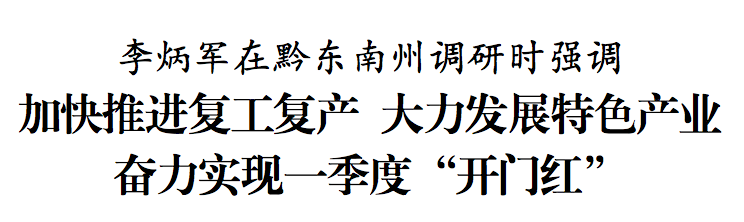2月19日至20日,省委副书记、省长李炳军到黔东南州麻江县、凯里市、黄平县调研复工复产和产业发展情况。他强调,要深入贯彻习近平总书记对贵州工作的重要讲话指示精神,全面落实省委经济工作会议、省两会部署,加快推进复工复产,大力发展特色优势产业,奋力实现一季度“开门红”,为完成全年目标任务打下坚实基础。省政协副主席、黔东南州委书记李建参加。