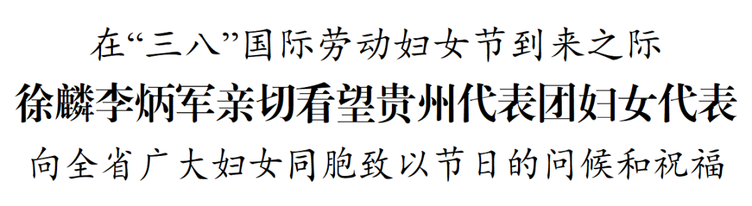 3月8日,在“三八”国际劳动妇女节到来之际,在京参加十四届全国人大二次会议的省委书记、省人大常委会主任徐麟,省委副书记、省长李炳军在驻地亲切看望贵州代表团女代表、女工作人员。中央提名在贵州选举的全国人大代表张抒扬、谭琳,省领导李元平、吴强、陶长海、桑维亮、杨永英、茆荣华、王永金参加活动。