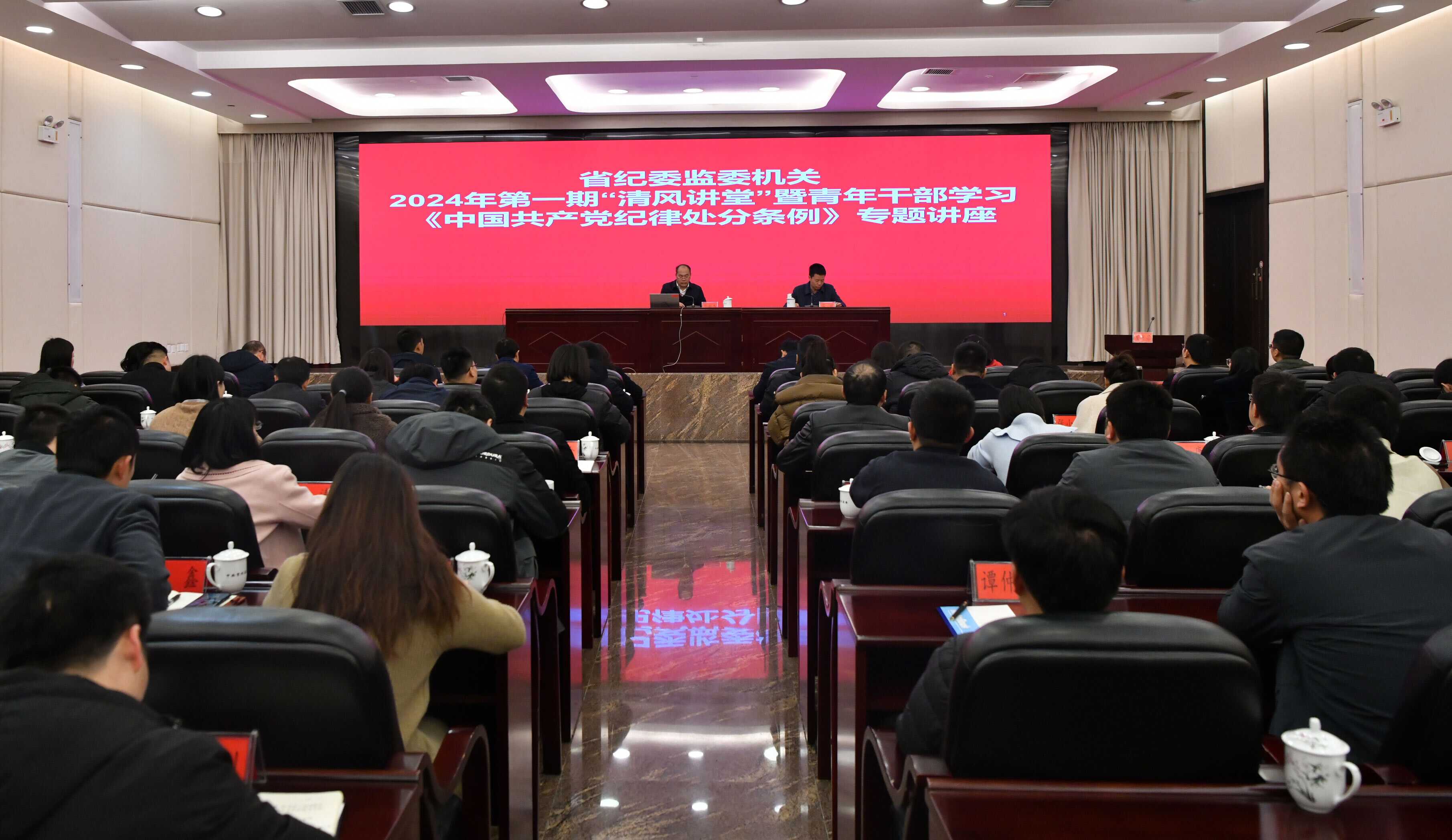 2024年3月6日,委机关青工委举办2024年第1期“清风讲堂”暨青年干部学习《中国共产党纪律处分条例》专题讲座,邀请省纪委常委、省监委委员,省纪委省监委党风政风监督室主任彭新杰同志为委机关青年干部作专题辅导。省委巡视机构、省纪委监委各派驻机构、委机关各内设机构、省纪委监委各所属事业单位青年干部代表70余人参加了专题讲座。