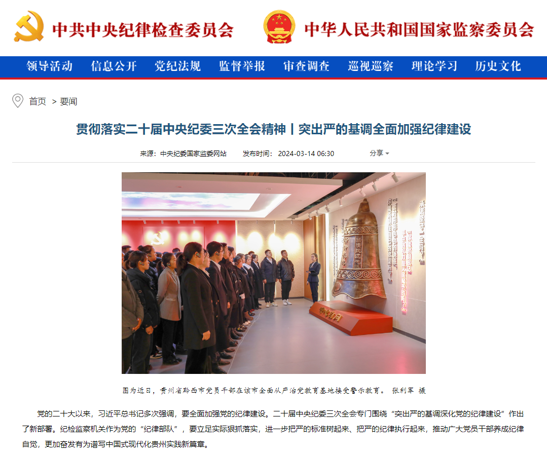 党的二十大以来,习近平总书记多次强调,要全面加强党的纪律建设。二十届中央纪委三次全会专门围绕“突出严的基调深化党的纪律建设”作出了新部署。纪检监察机关作为党的“纪律部队”,要立足实际狠抓落实,进一步把严的标准树起来、把严的纪律执行起来,推动广大党员干部养成纪律自觉,更加奋发有为谱写中国式现代化贵州实践新篇章。