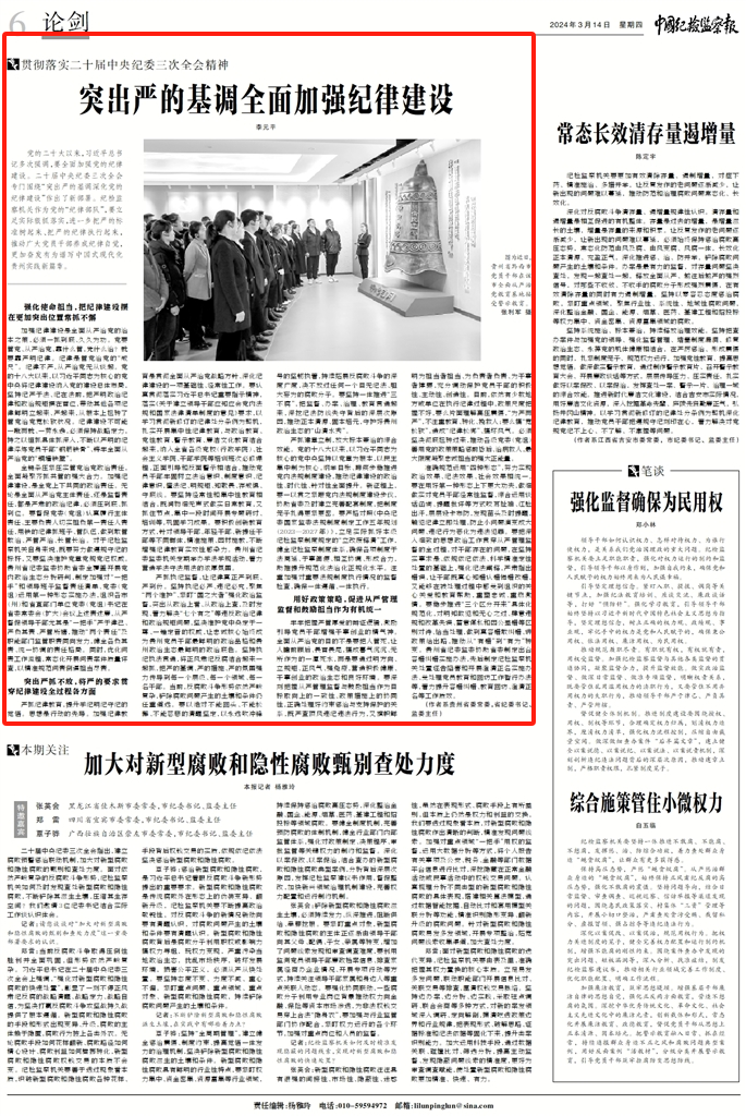 2024年3月14日,《中国纪检监察报》、中央纪委国家监委网站刊发省委常委、省纪委书记、省监委主任李元平署名文章《突出严的基调全面加强纪律建设》