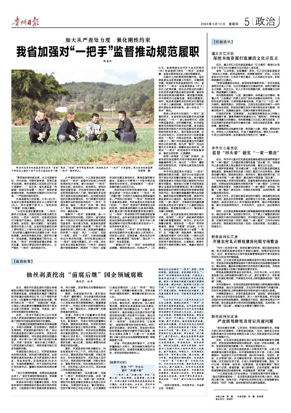 习近平总书记在二十届中央纪委三次全会上强调,要健全加强对“一把手”和领导班子监督配套制度。全市各级纪检监察机关将深入贯彻落实习近平总书记重要讲话精神和中央纪委三次全会、省纪委三次全会部署,持续提升监督质效,督促各级“一把手”严于律己、严负其责、严管所辖。要严实责任。通过现场述责述廉、面对面谈话提醒、党内政治生态分析研判等方式,压紧压实各级党委(党组)书记全面从严治党“第一责任人”责任,严格贯彻执行民主集中制,带头做到“两个维护”。要严管权力。健全各类监督贯通协同机制,聚焦“一把手”选人用人权、重大决策部署权、资金使用权、项目安排权,强化政治监督、做实日常监督,切实保证人民赋予的权力始终用来为人民服务。要严惩腐败。持续发力、纵深推进反腐败斗争,紧盯重点问题、重点领域、重点对象、新型腐败和隐性腐败,坚决查处“一把手”等“关键少数”不收敛不收手、不作为乱作为问题,维护风清气正政治生态。要严格教育。用好用活典型案例,抓实党性党风党纪教育,开展集中性纪律教育,督促把以权谋私、贪污腐败看成是极大的耻辱。坚持严管和厚爱结合,推动各级“一把手”树立和践行正确政绩观。(贵阳市委常委、市纪委书记、市监委主任 郑建国)