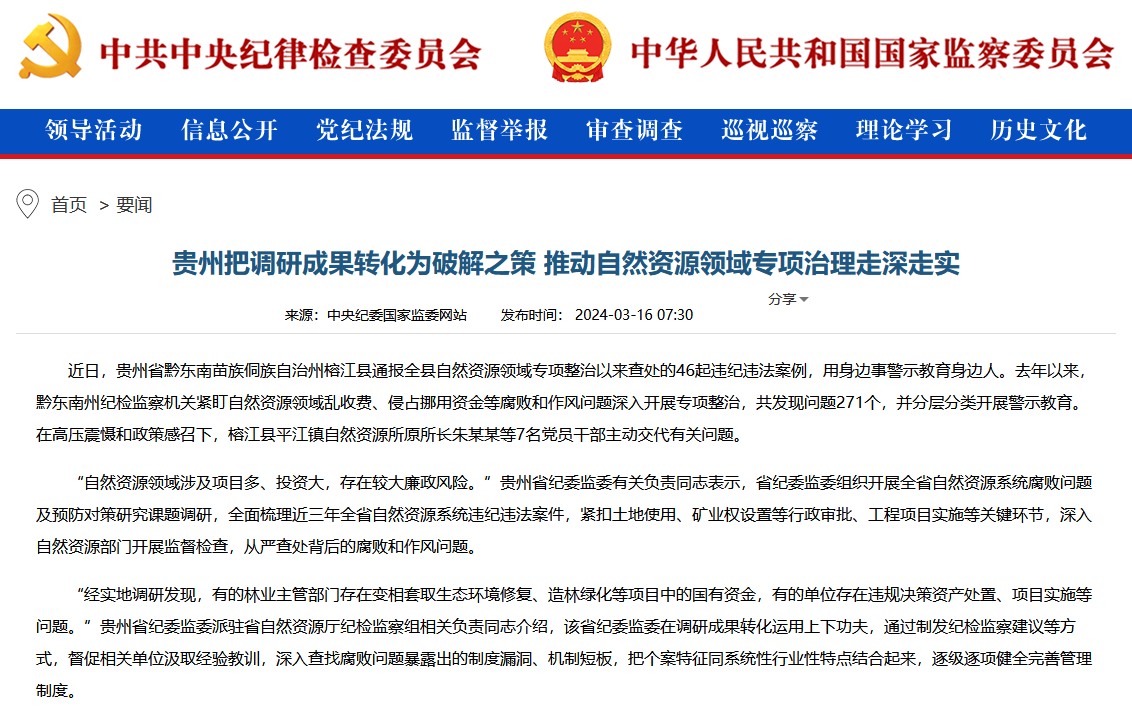 “自然资源领域涉及项目多、投资大,存在较大廉政风险。”贵州省纪委监委有关负责同志表示,省纪委监委组织开展全省自然资源系统腐败问题及预防对策研究课题调研,全面梳理近三年全省自然资源系统违纪违法案件,紧扣土地使用、矿业权设置等行政审批、工程项目实施等关键环节,深入自然资源部门开展监督检查,从严查处背后的腐败和作风问题。