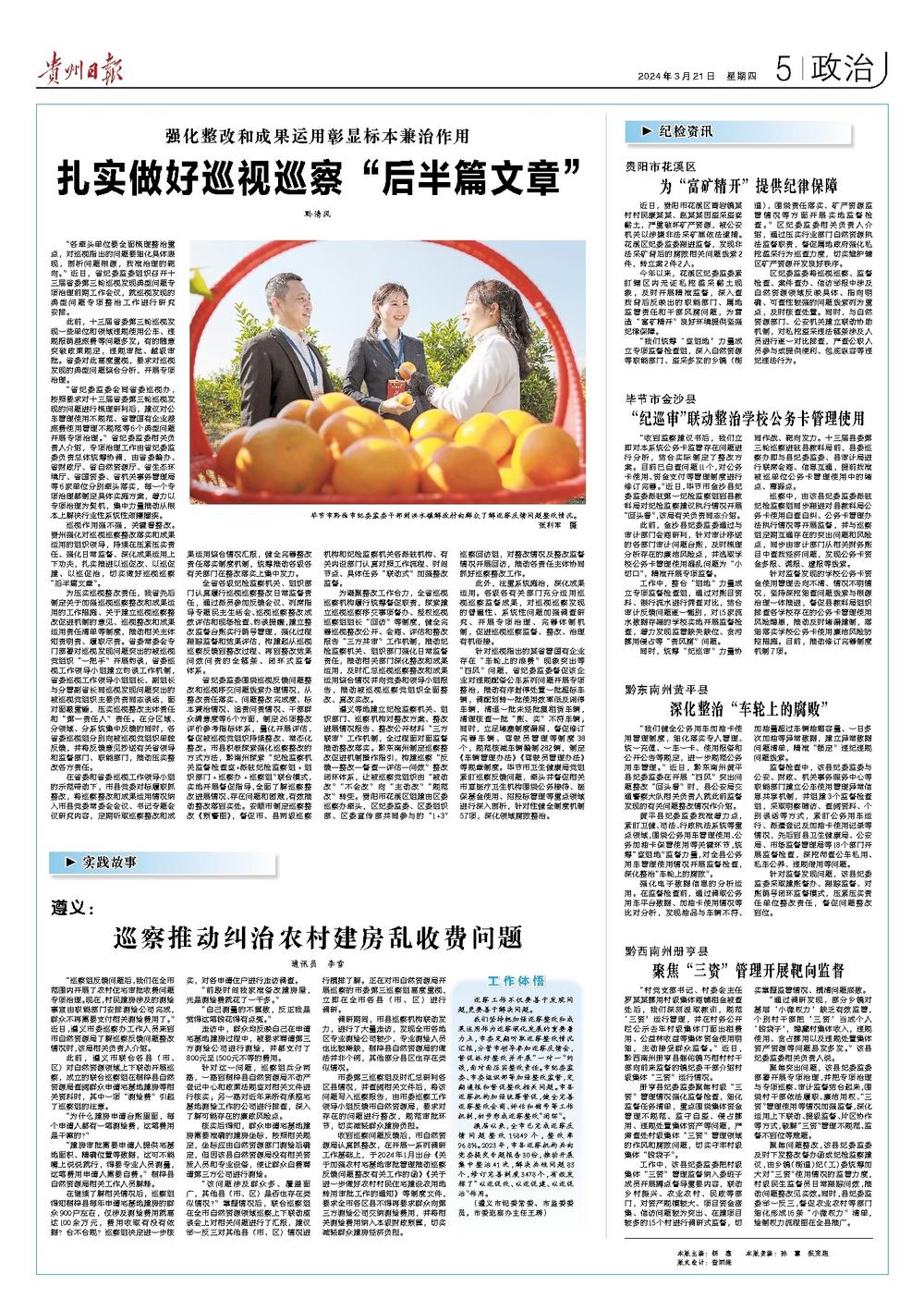 巡视作用强不强,关键看整改。贵州强化对巡视巡察整改落实和成果运用的组织领导,持续在压紧压实责任、强化日常监督、深化成果运用上下功夫,扎实推进以巡促改、以巡促建、以巡促治,切实做好巡视巡察“后半篇文章”。