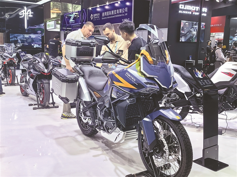 图为采购商在广交会摩托车展区咨询某企业新品车型。 记者 柴雅欣 摄