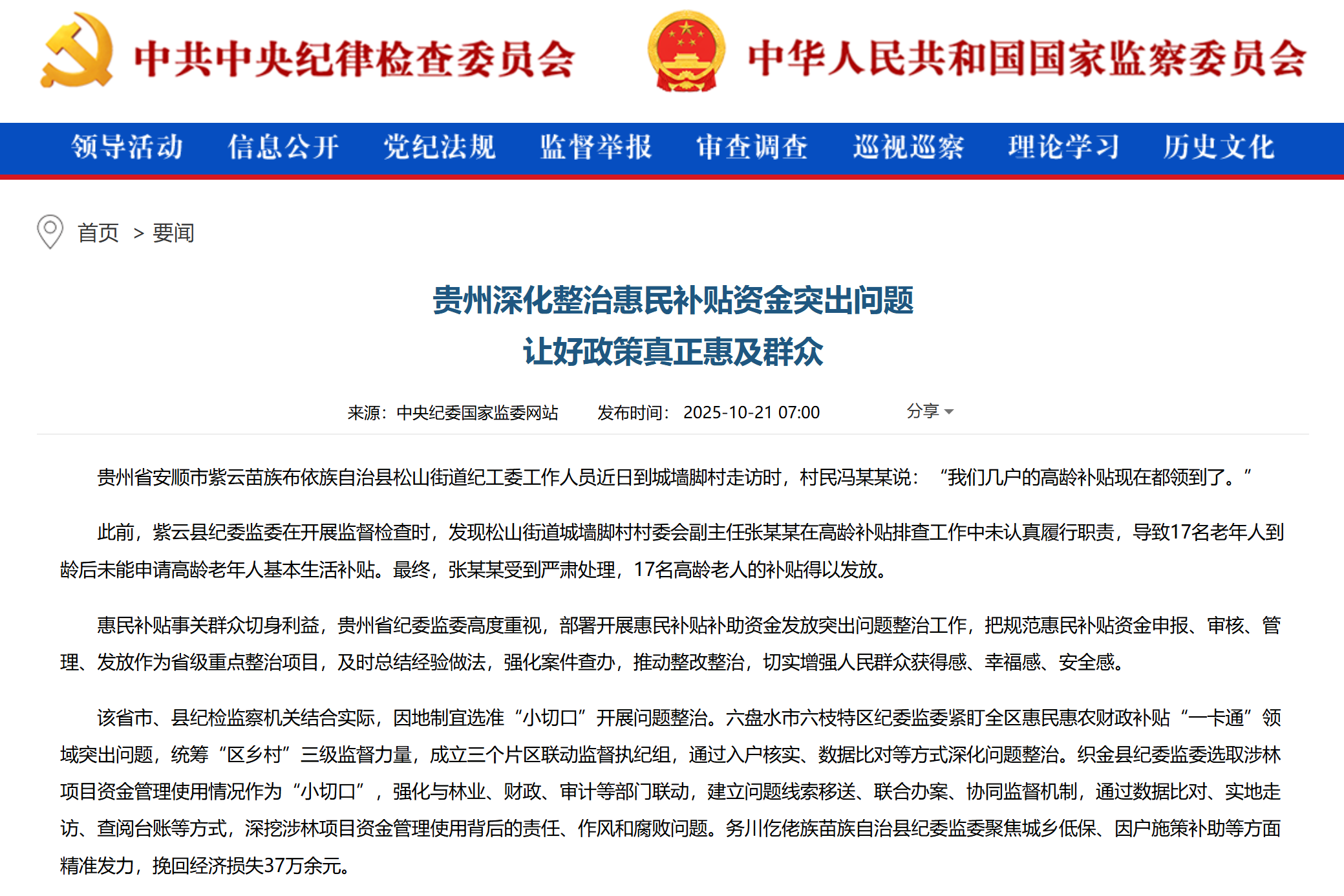 此前,紫云县纪委监委在开展监督检查时,发现松山街道城墙脚村村委会副主任张某某在高龄补贴排查工作中未认真履行职责,导致17名老年人到龄后未能申请高龄老年人基本生活补贴。最终,张某某受到严肃处理,17名高龄老人的补贴得以发放。