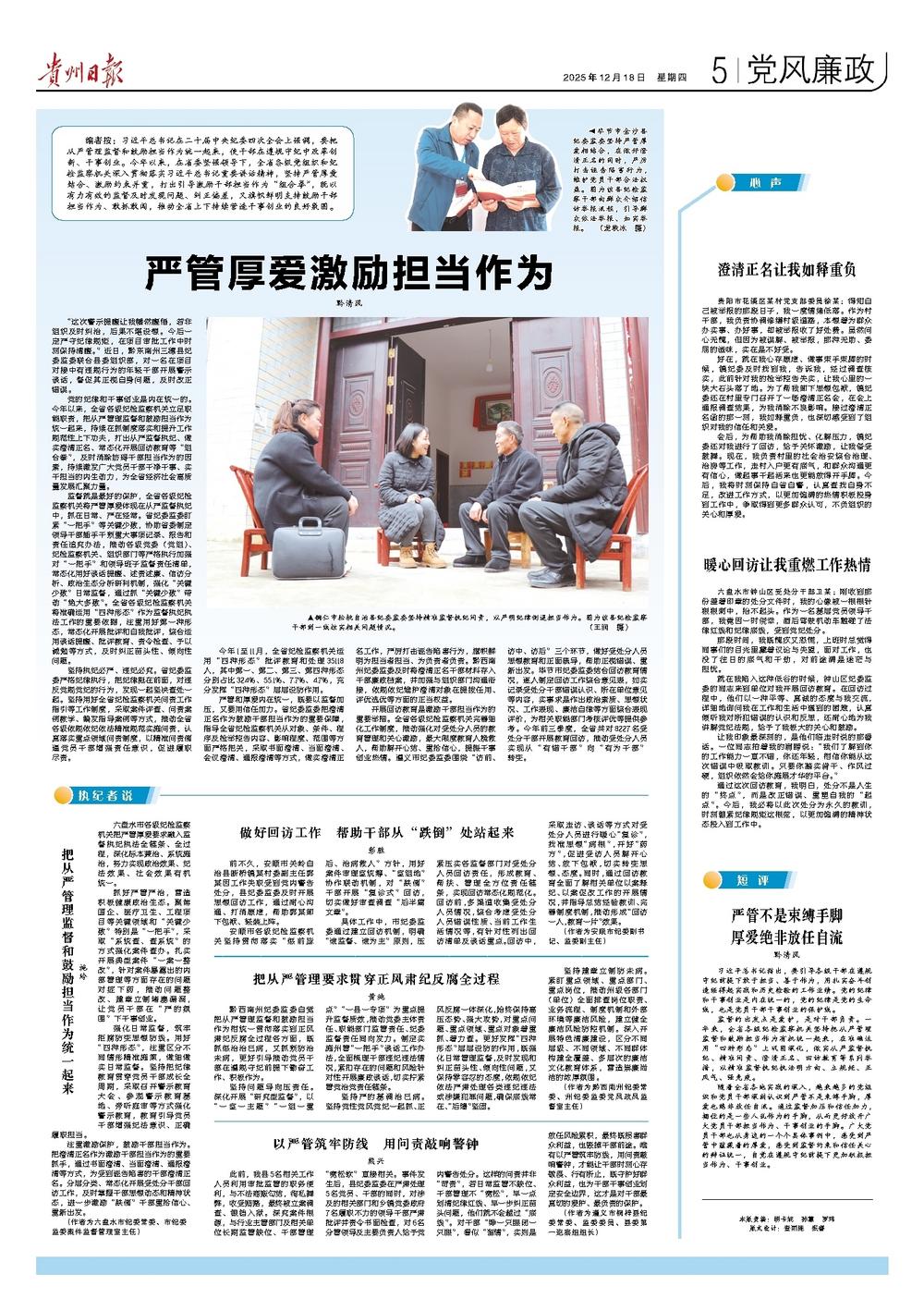 此前,我县5名相关工作人员利用审批监管的职务便利,与不法商贩勾结,徇私舞弊,收受贿赂,最终被立案调查、锒铛入狱。深究案件根源,与行业主管部门及相关单位长期监管缺位、干部管理“宽松软”直接相关。事件发生后,县纪委监委在严肃处理5名党员、干部的同时,对涉及的相关部门和乡镇党委政府7名履职不力的领导干部严肃批评并责令书面检查,对6名分管领导及主要负责人给予党内警告处分。这样的问责并非“苛责”,若日常监管不缺位、干部管理不“宽松”,早一点划清纪律红线、早一步纠正苗头问题,他们就不会越过“底线”。对干部“睁一只眼闭一只眼”,看似“留情”,实则是放任风险累积,最终既损害群众利益,也毁掉干部前途。唯有以严管筑牢防线,用问责敲响警钟,才能让干部时刻心存敬畏、行有所止,既守护好群众利益,也为干部干事创业划定安全边界,这才是对干部最真切的爱护、最负责的保护。(作者为遵义市桐梓县纪委常委、监委委员、县委第一巡察组组长 熊兴)
