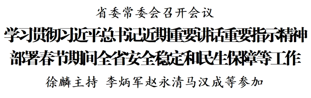 2月12日,省委常委会召开会议,深入学习贯彻习近平总书记近期重要讲话重要指示精神,学习贯彻全国社会工作部长会议、全国科技工作会议、全国公安厅局长会议精神,部署春节期间全省安全稳定和民生保障、群众身边不正之风和腐败问题集中整治等工作。
