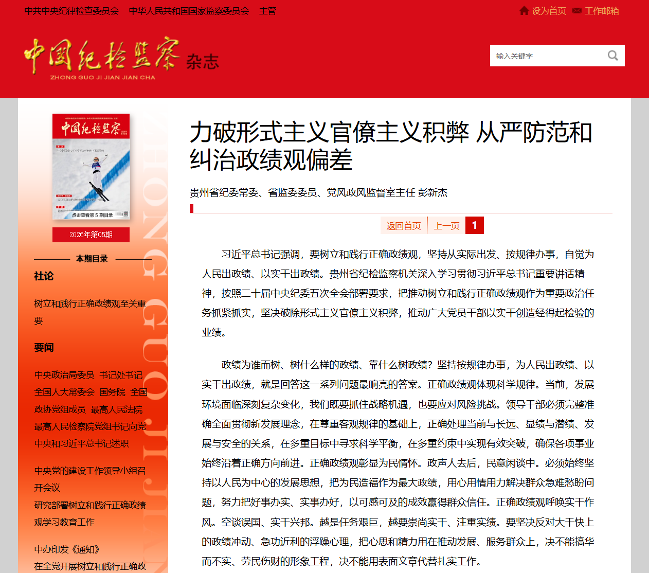 《中国纪检监察》杂志2026年第5期“正风深一度”栏目刊发省纪委常委、省监委委员、党风政风监督室主任彭新杰同志署名文章《力破形式主义官僚主义积弊 从严防范和纠治政绩观偏差》,现予以全文转载。