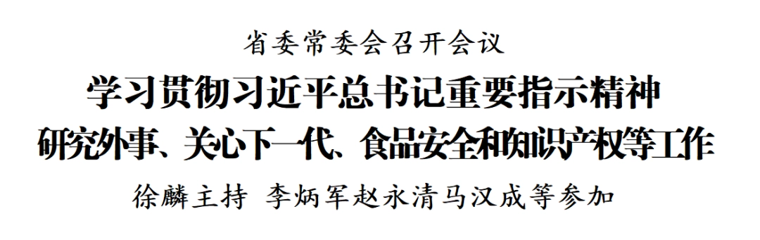 3月14日,省委常委会召开会议,学习贯彻习近平总书记重要指示精神,听取全省外事、关心下一代、食品安全和知识产权强省建设等情况汇报,研究部署有关工作。